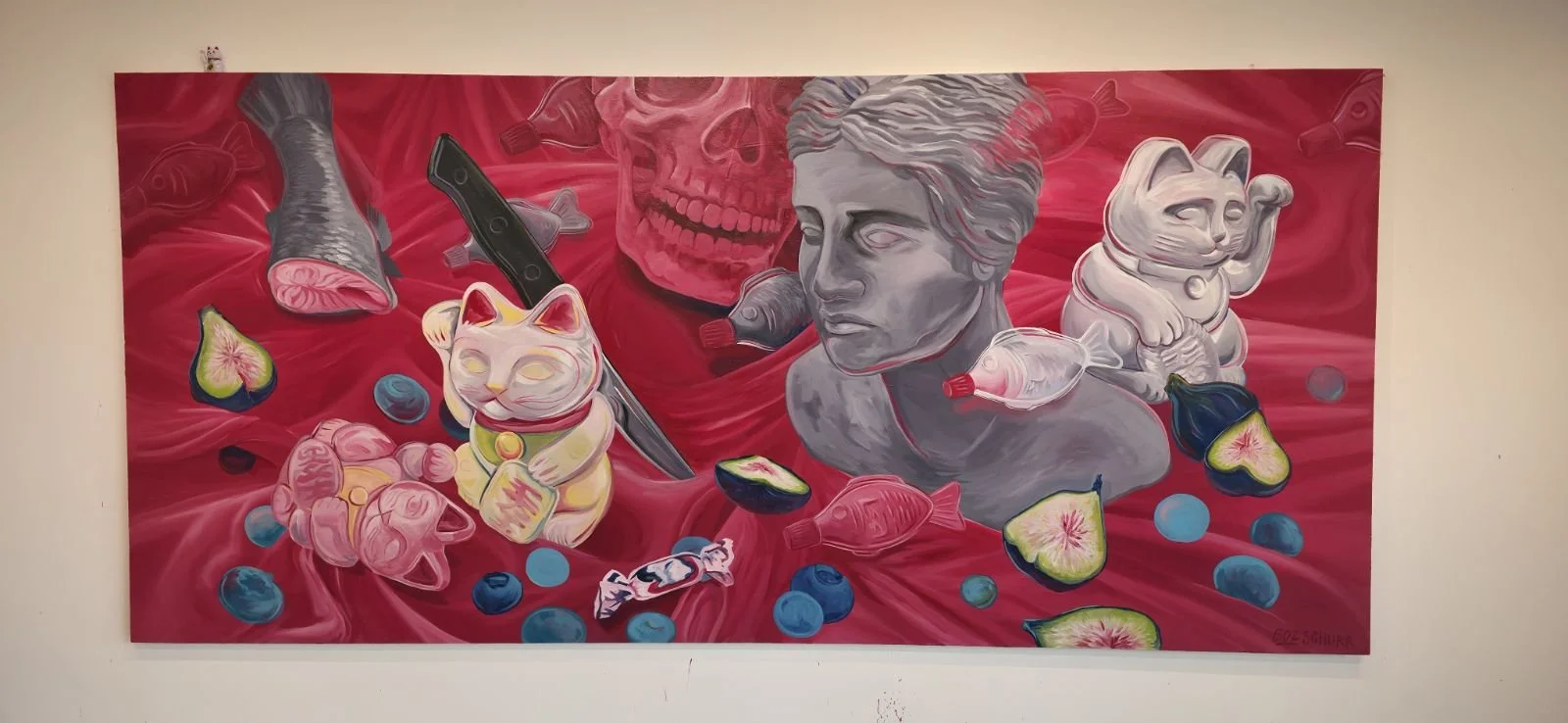 Although there is one remaining still life on view, this canvas could be considered a complete body of work. Underneath the final red surface are nine other paintings, each representing nine personal, pivotal summers or seasons of life. Each object in every respective composition holds personal messages from the artist to the artist, in a quiet, visual conversation about the past, present and future.
