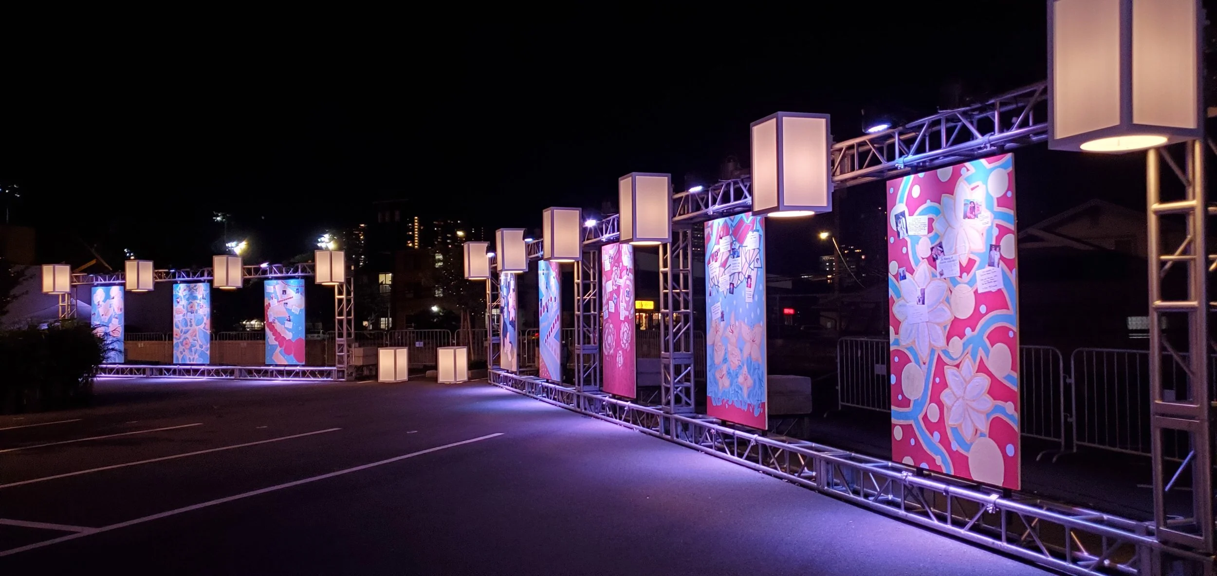 The students and Kumu Boz created several murals for the Shinnyo-en Floating Lantern Ceremony. Unlike previous years, due the the pandemic, the ceremony was unable to be held at Ala Moan beach park. Instead Kumu boz created two large geometric flower murals (See Murals) and the students created 8 vertical flower murals for participants to place messages of hope and remembrance for past loved ones.