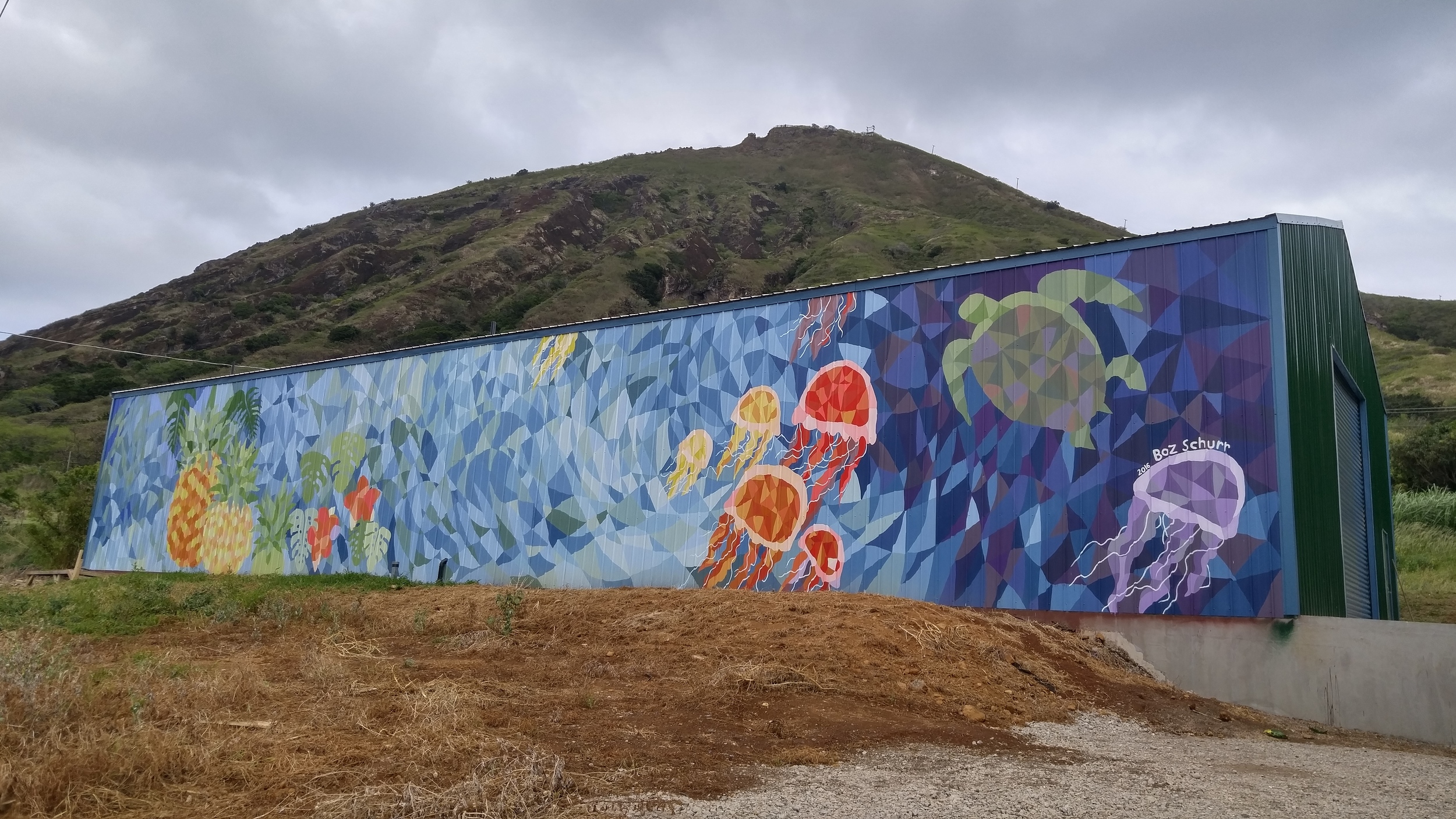 Over 100 feet long and 16 feet tall I can safely say this is the biggest painting I've ever done. Since I'm teaching full time this project had to be completed on the weekends in the early morning to outpace the sun. This means driving from Ewa to Hawaii Kai at 4am! Whew! (for those that don't know, this means driving across Oahu every weekend for two months!)