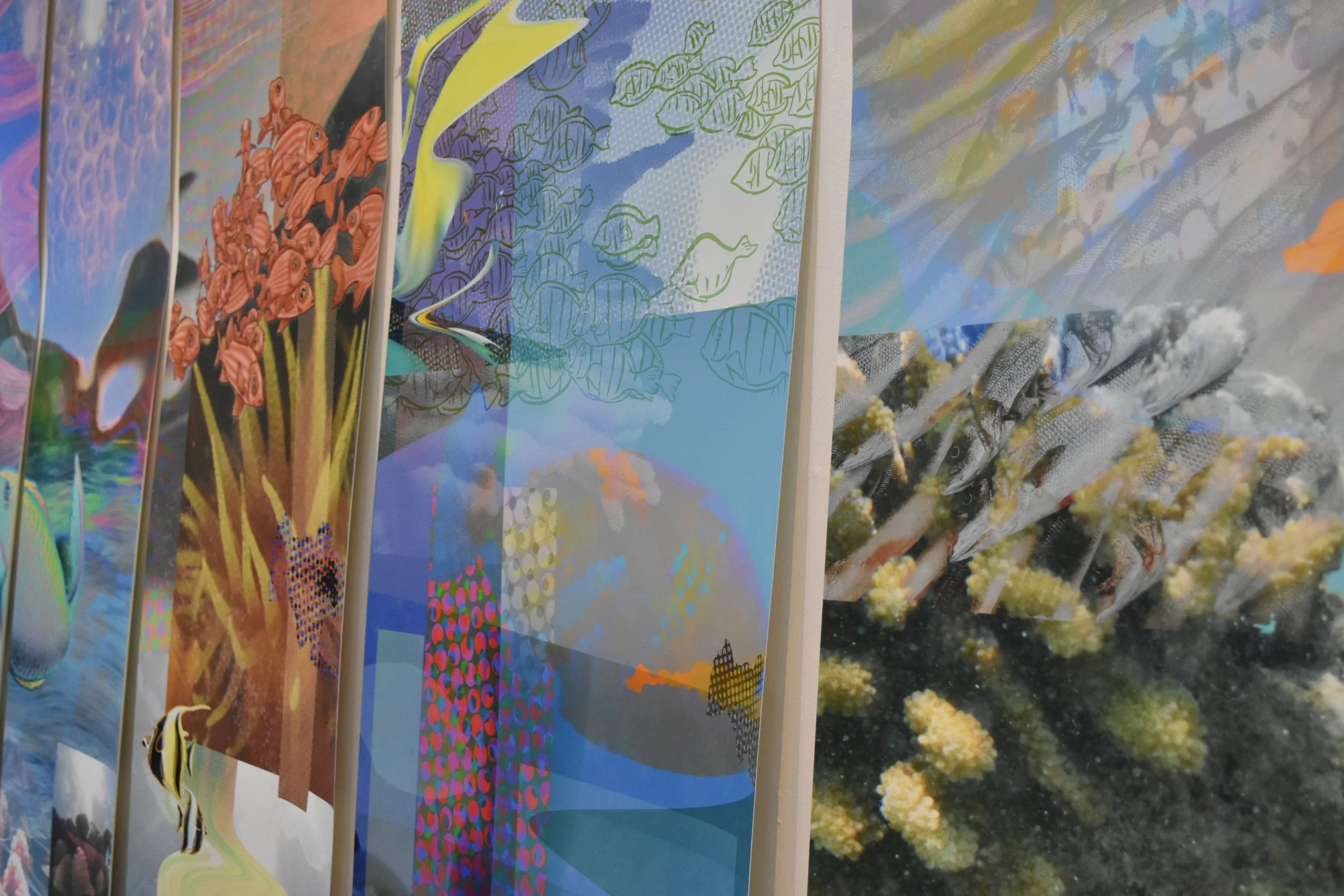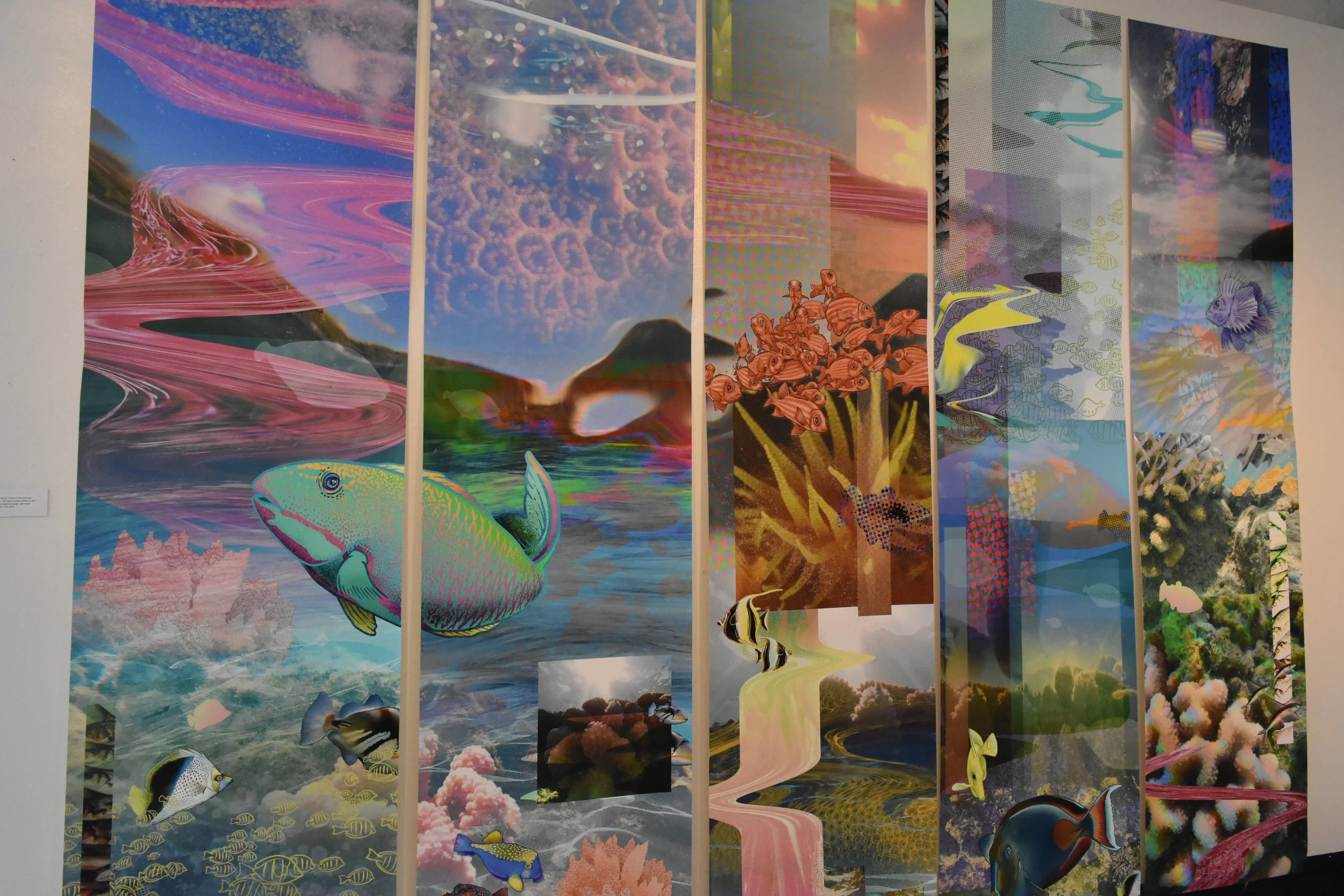 The Day at Hanauma Bay photo and illustration collage started as large photo installation intended to completely surround the viewer, much like a mural but without damaging the wall space. The original goal was to subtly show the negative impacts humans were having on this space. Not a radical concept as human have been damaging the nature world since time immemorial. Much of the conversation the artists and scientists had was about the post Covid recovery of the bay’s habitat and how now, the policies and procedures have changed in such a way that conservation is always at the forefront of all henceforth decision making. However, after much discussion it was realized that showcasing negativity could potentially not have an desired effect on the audience, and could please them feeling sad, guilty and remorseful. Instead, the new goal became showcasing the wonder, otherworldliness and awe one feels when fully immersed in their nature environments.